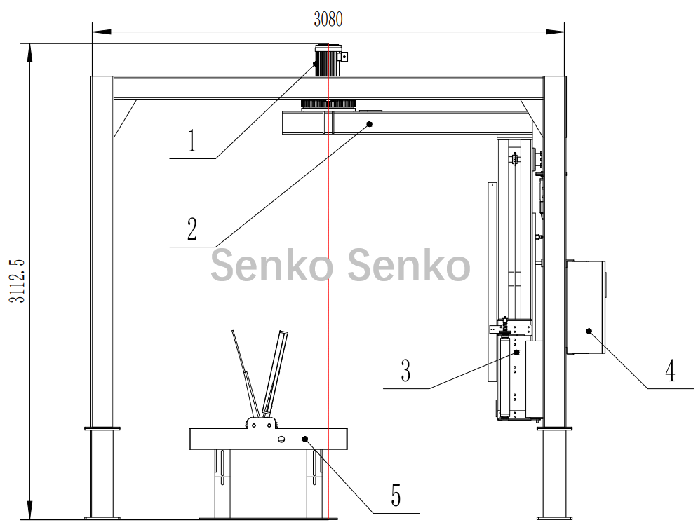 | 1. Motor Rotativo | 2. Rack Rotativo | 3. Suporte de Elevação | 4. Gabinete de controle eletrônico | 5. Cortador de filme |