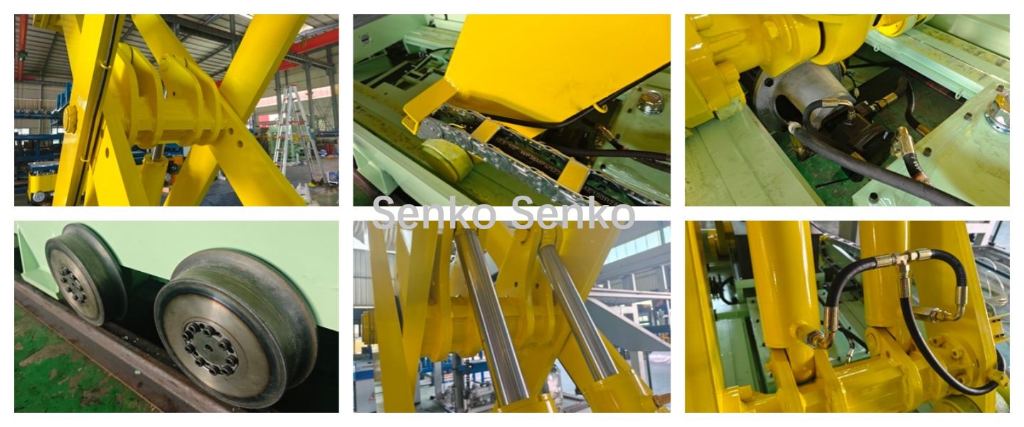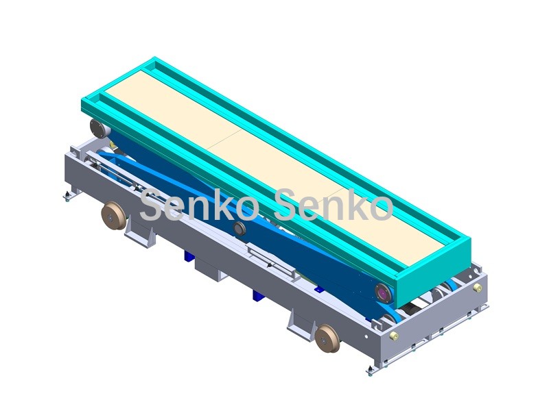 O servomotor aciona as rodas da esteira para se moverem na esteira transversal. A esteira longitudinal do carro de transporte pode ser alinhada com as seguintes esteiras longitudinais pré-instaladas: a esteira de saída de tijolos úmidos da máquina de fabricação de tijolos, a esteira de entrada da máquina de empilhamento de tijolos, as esteiras de cada forno de cura e a esteira de retorno/entrega de paletes. Após o alinhamento, o carrinho de transporte do carro de transporte pode entrar e sair do carro.