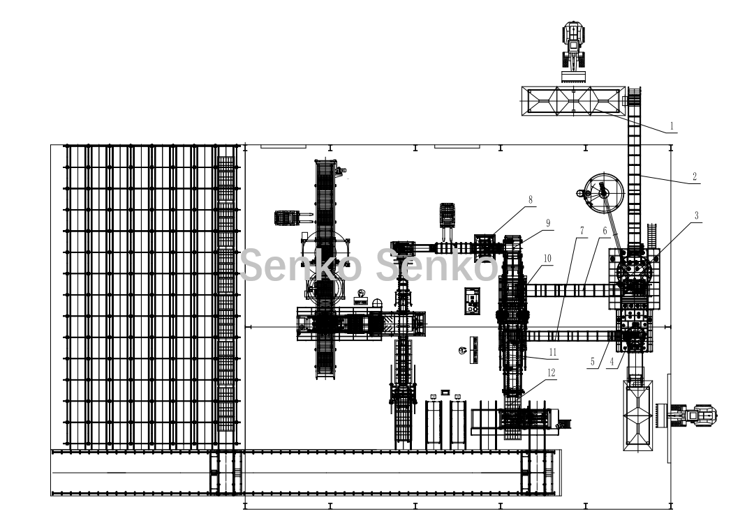 | 7. Transportador de mistura de pigmentos | 8. Carregamento de paletes | 9. Alimentador de paletes | 10. Máquina de conformação | 11, Esteira transportadora | 12. Máquina de empilhamento |