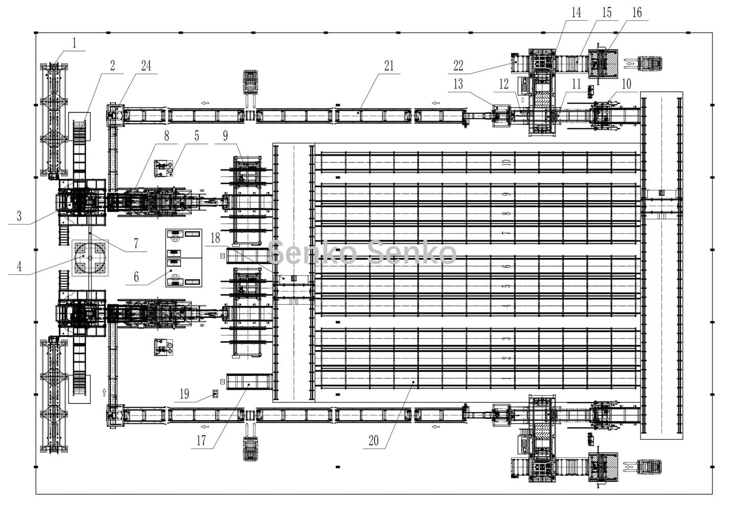 | 16. Máquina de decapagem rotativa inferior | 17, Carrinho de transferência | 18,RGV | 19, Estação de carregamento | 20, Forno de cura |