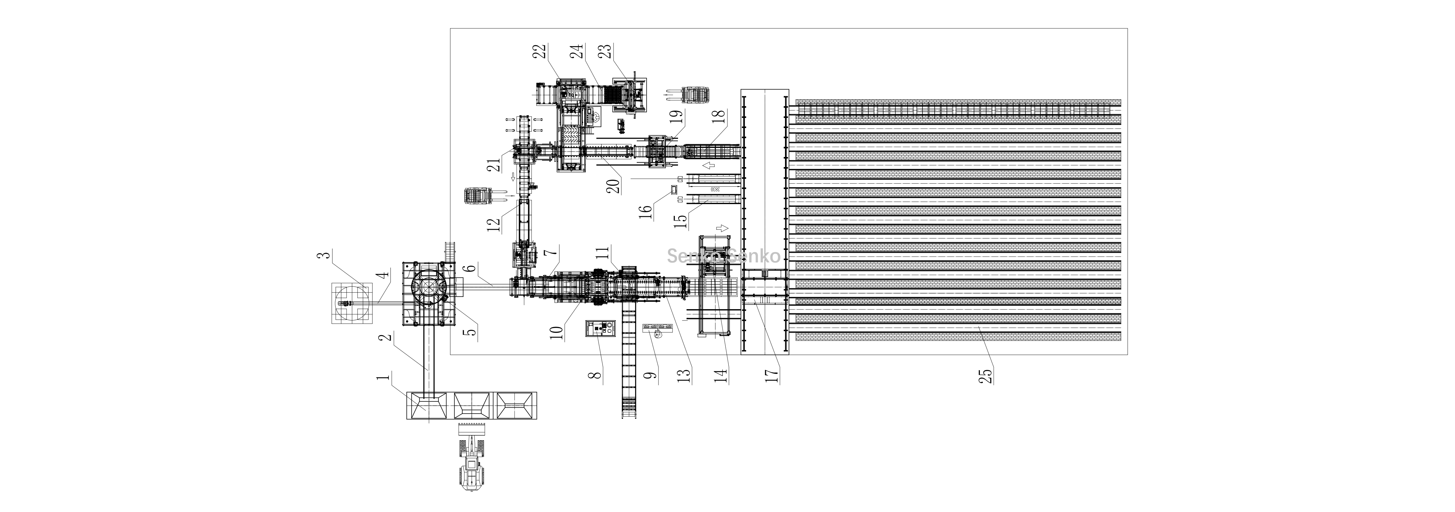 | 21, Paletizador | 22, Máquina de empilhar tijolos | 23, Vedação rotativa inferior | 24, Transportador de pilha | 25, Forno de cura |