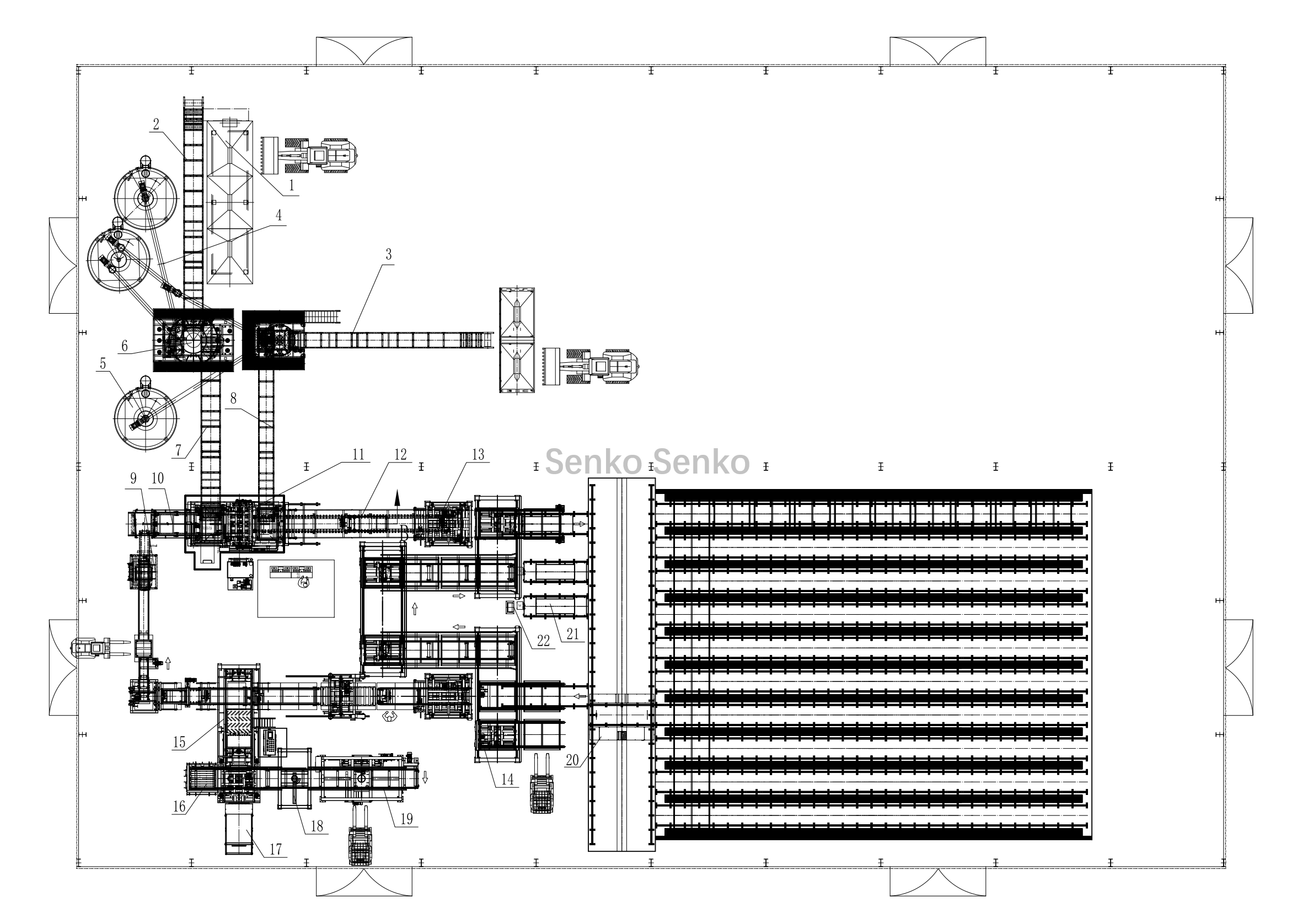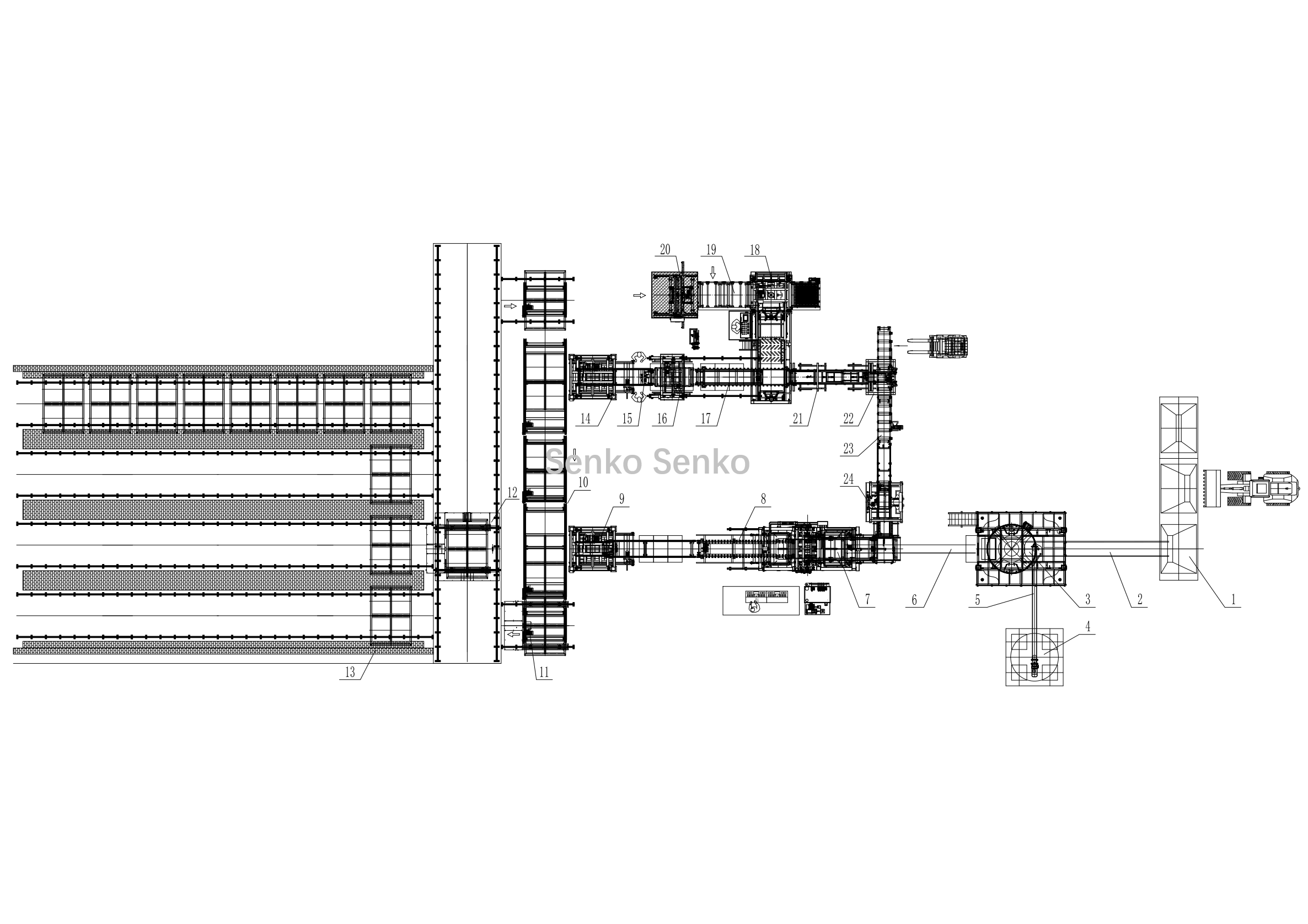 | 19, Transportador de pilha | 20. Máquina de embalagem e desempacotamento | 21, Esteira transportadora de paletes vazias | 22, Paletizador | 23, Transportador de paletes | 24, Carregamento de paletes |