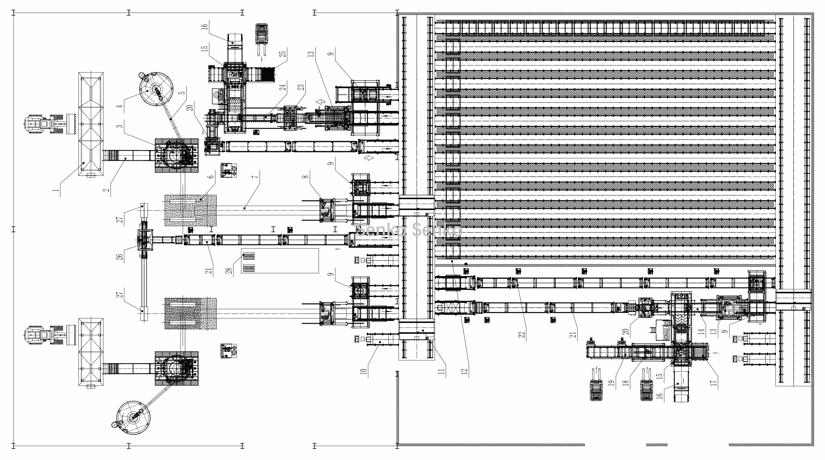 | 19, Máquina de descascar | 20, Paletizador vazio | 21, Transportador de paletes | 22, Esteira transportadora de prateleiras vazias | 23, Elevador de paletes de tijolos | 24, Transportador de paletes de tijolos |
